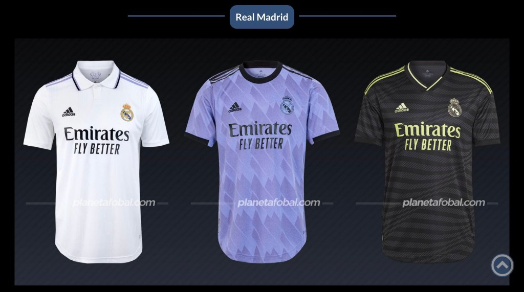 El uniforme local para los «merengues» lleva el blanco tradicional con un tramado de su escudo recorriendo la tela. En el visitante se usará un tenue morado con franjas diagonales inspiradas en la que se aprecia dentro de su logo. En la tercera equipación se hará presente el color negro como predominante con el amarillo para los detalles y el gris claro para las rayas y líneas que decoran el frente y se basan en el formato que tendrá la cubierta metálica del renovado estadio Santiago Bernabéu.